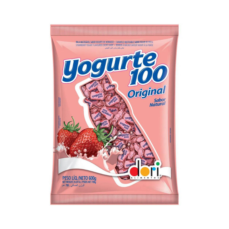 Tradicional e deliciosa bala mastigável com sabor de iogurte de morango.